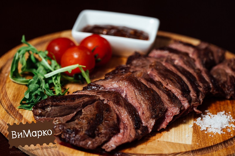 Набір продуктів для приготування страви і інструкція. В основі - замаринований стейк з лопатки частини бичка. Через щільну структуру шматка проходить довга промениста жилка, яка в процесі приготування розм'якшується і робить м'ясо соковитим 420 г, обсмажені на грилі і замариновані кукурудзяні качани 200 г, соус діжонский на основі гірчиці 30 г, розмарин і часник для додання пікантності та аромату м'яса 3 г , гімалайська сіль 2 г