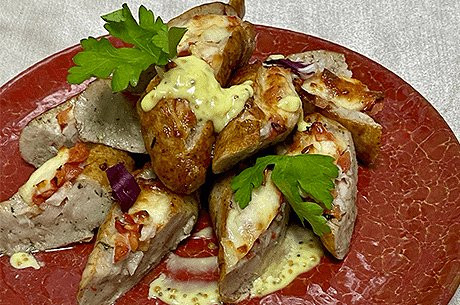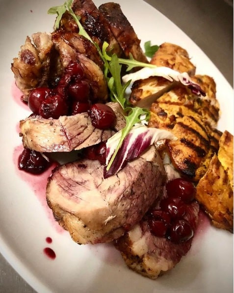 з овочами і гратінованним виноградом під соусом з чорної смородини